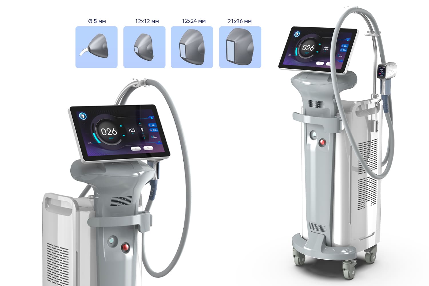 4 довжини хвилі в одній маніпулі (755, 808, 940, 1064 нм) , великий ресурс до 100 мільйонів спалахів і можливість вибору розміру плями (4 накладних аплікатора: Φ5, 12×12, 12×24, 12×36 мм).
