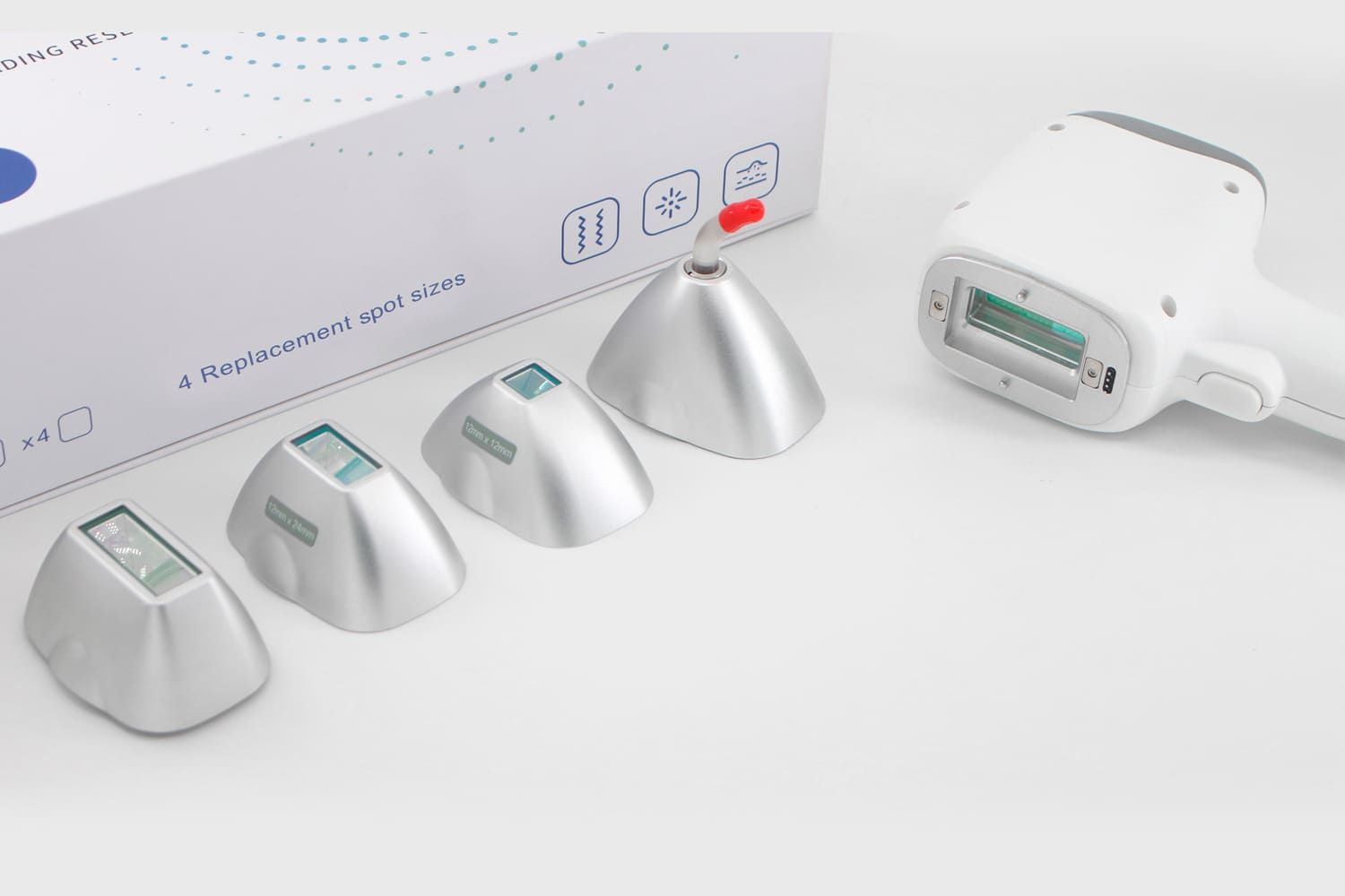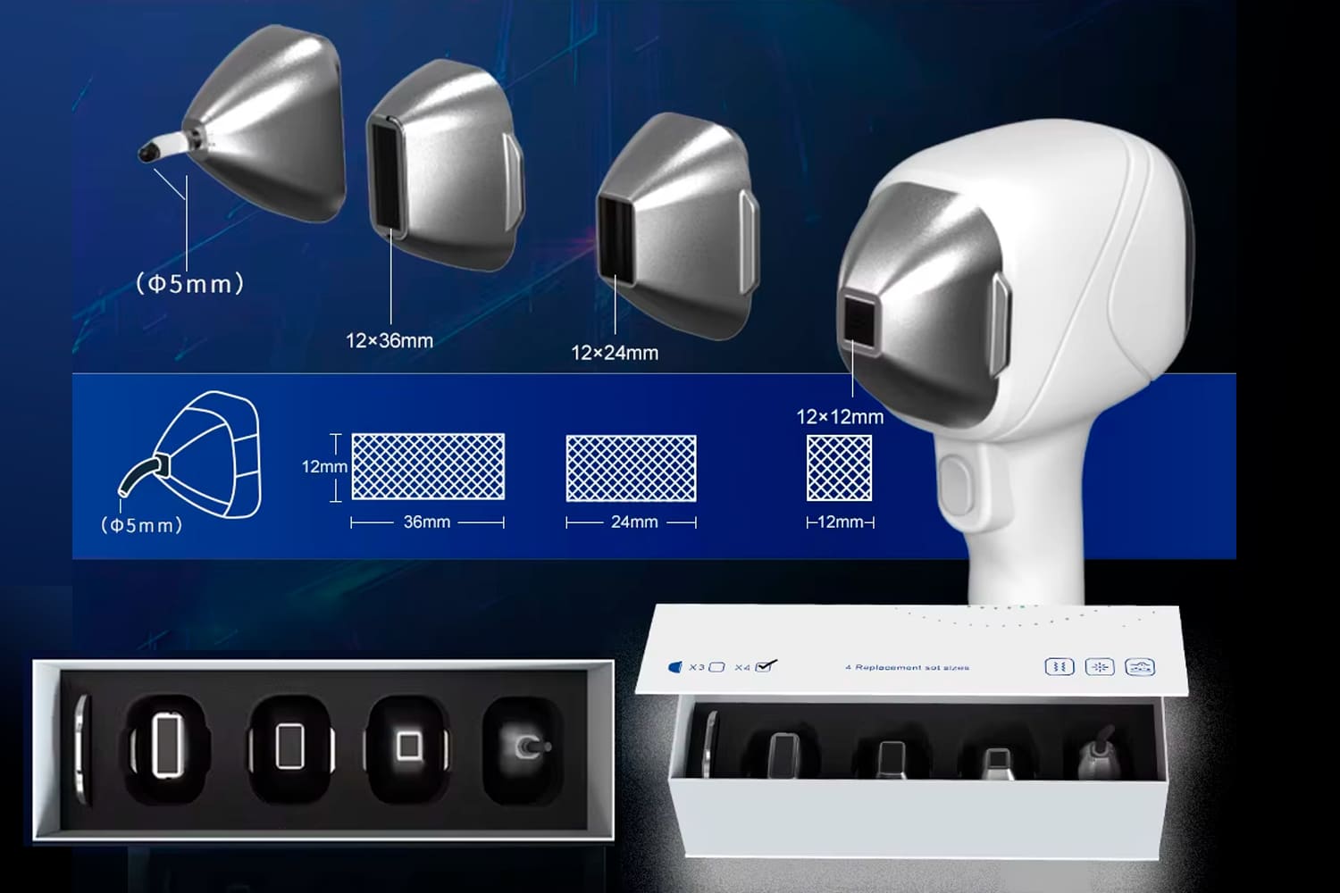 5. Змінні аплікатори з різними розмірами плями: Φ5 мм / 12x12 / 12x24 / 12x36 мм - Можливість зручно та швидко обробляти як великі зони (спина, ноги), так і малі (обличчя, бікіні), а також у вухах та носі.