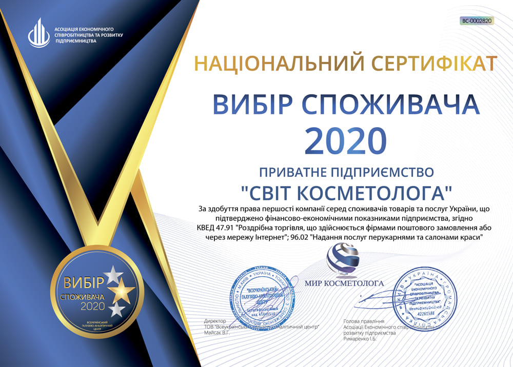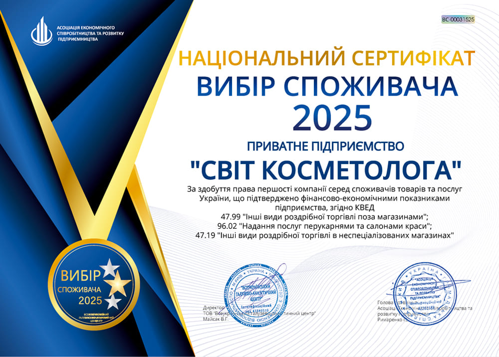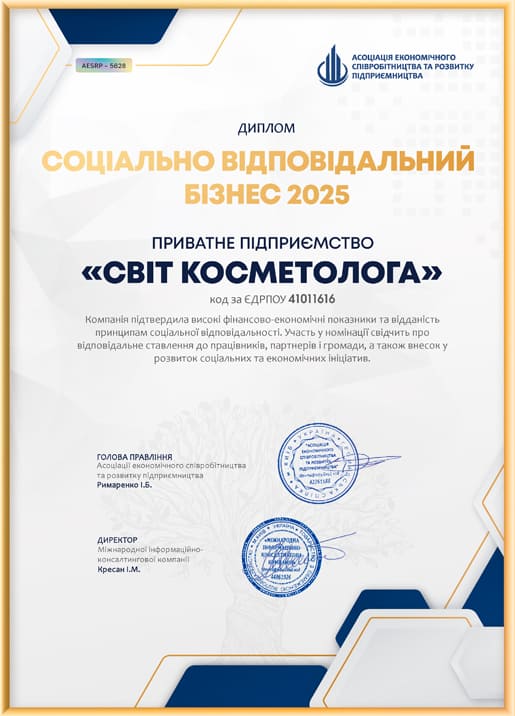 В 2026 році компанія "Світ косметолога" отримала відзнаку «Соціально відповідальний бізнес», що є офіційним визнанням компанії такою, яка добровільно інтегрує соціальні, екологічні та етичні ініціативи, підтверджує стійку роботу, підтримку ЗСУ, допомогу громадам, своєчасну сплату податків та захист працівників. Це знак якості, що свідчить про довіру та позитивний вплив на суспільство.