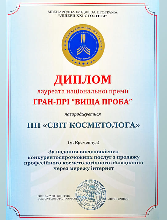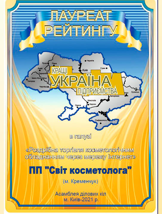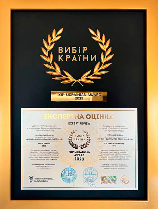 Понад 11 років компанія "Світ косметолога" є одним із лідерів продажу косметологічного обладнання в Україні. Компанія є двократним переможцем нагороди «Вибір Країни» у номінації «Постачальник косметологічного обладнання року», трикратно визнана «Компанією року» у 2020, 2022 та 2024 рр, як краща компанія галузі згідно реєстру “Надійних та інвестиційно привабливих підприємтв” в Україні, була нагороджена нагородою "Вища проба" за надання високоякісних конкурентноспроможних послуг з продажу косметологічного обладнання через мережу Інтернет, двократно нагородами "Вибір споживача" та “Кращі підприємства України”.